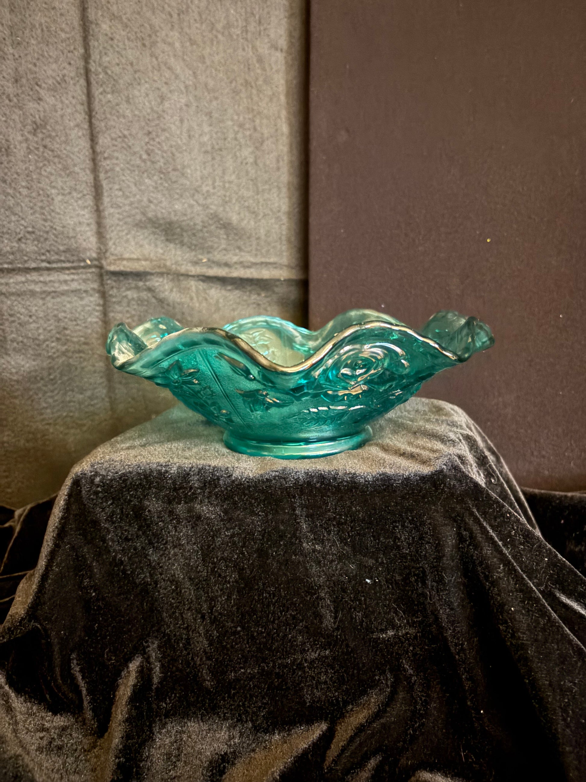 Dive into elegance with this charming Aqua Rose Glass Bowl, where vintage-inspired design meets everyday functionality. The soft aqua blue glass showcases delicate rose patterns that dance across the surface, while the ruffled edge adds a whimsical, handcrafted touch. Perfect for serving snacks, displaying potpourri, or simply brightening up your décor, this piece brings a splash of color and personality to any room. A delightful accent that proves beautiful things can be practical too.