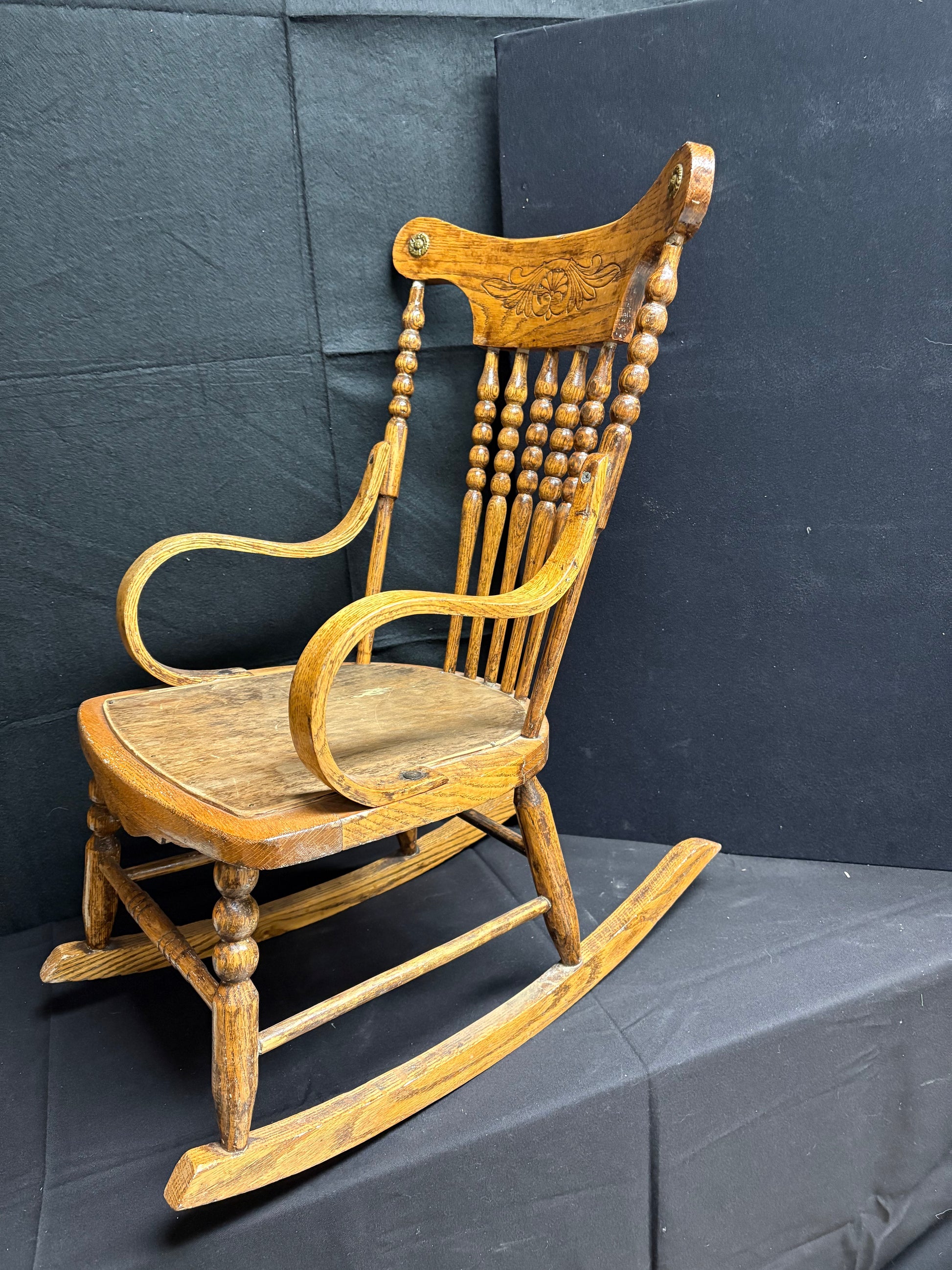 This well-worn vintage oak rocker is brimming with character and charm! Weathered by years of gentle use, its natural patina tells stories of countless bedtime songs and quiet moments. Built to last, this sturdy wooden rocker offers the perfect perch for snuggles, stories, and soothing rhythms. Each scuff and mark is a badge of honor—proof that this little beauty has earned its place as a cherished family treasure.